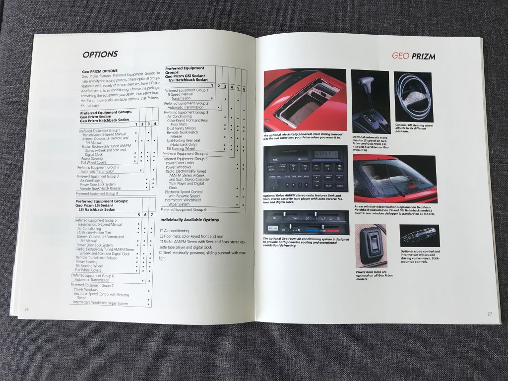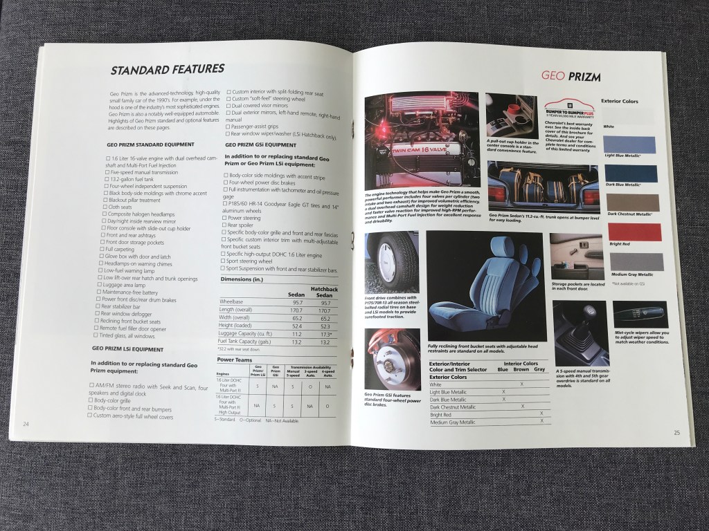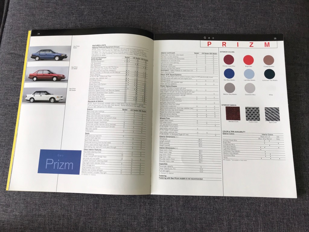Conclusively identifying these rogue two colors has proven difficult without any documentation. The first, a 1990 hatchback, appears to be a little lighter shade than the Dark Chestnut Metallic offered in ’90, but could simply be suffering from nearly three decades of solar radiation. The second car (a 1991) appears to be the Silver Metallic color listed for other lesser 1991 Prizm models. Of course, this is assuming that both are factory paint jobs. In any case, it is widely known that options and colors change through model years and in the time between the printing of the brochures and the actual production run – there’s even a disclaimer in the book: “we reserve the right to make changes at any time, without notice, in prices, colors, materials, equipment…”